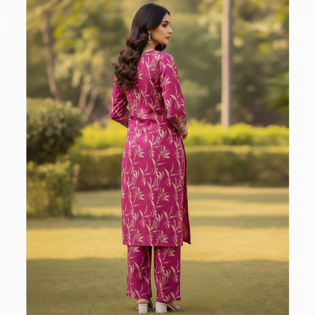 • Design: A vibrant magenta base contrasted with an elegant, all-over beige willow leaf pattern and intricate lace-style embroidery on the sleeve cuffs.