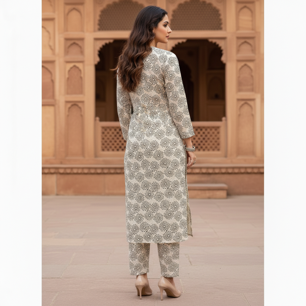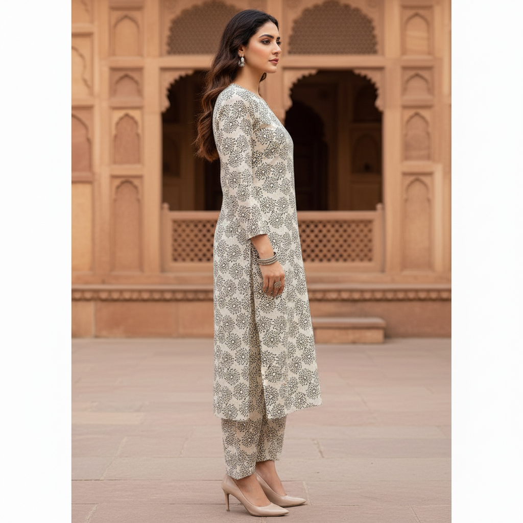 • Cut: A classic 2-piece co-ord set featuring a long straight-cut shirt with matching printed trousers, tailored for an elegant everyday silhouette.