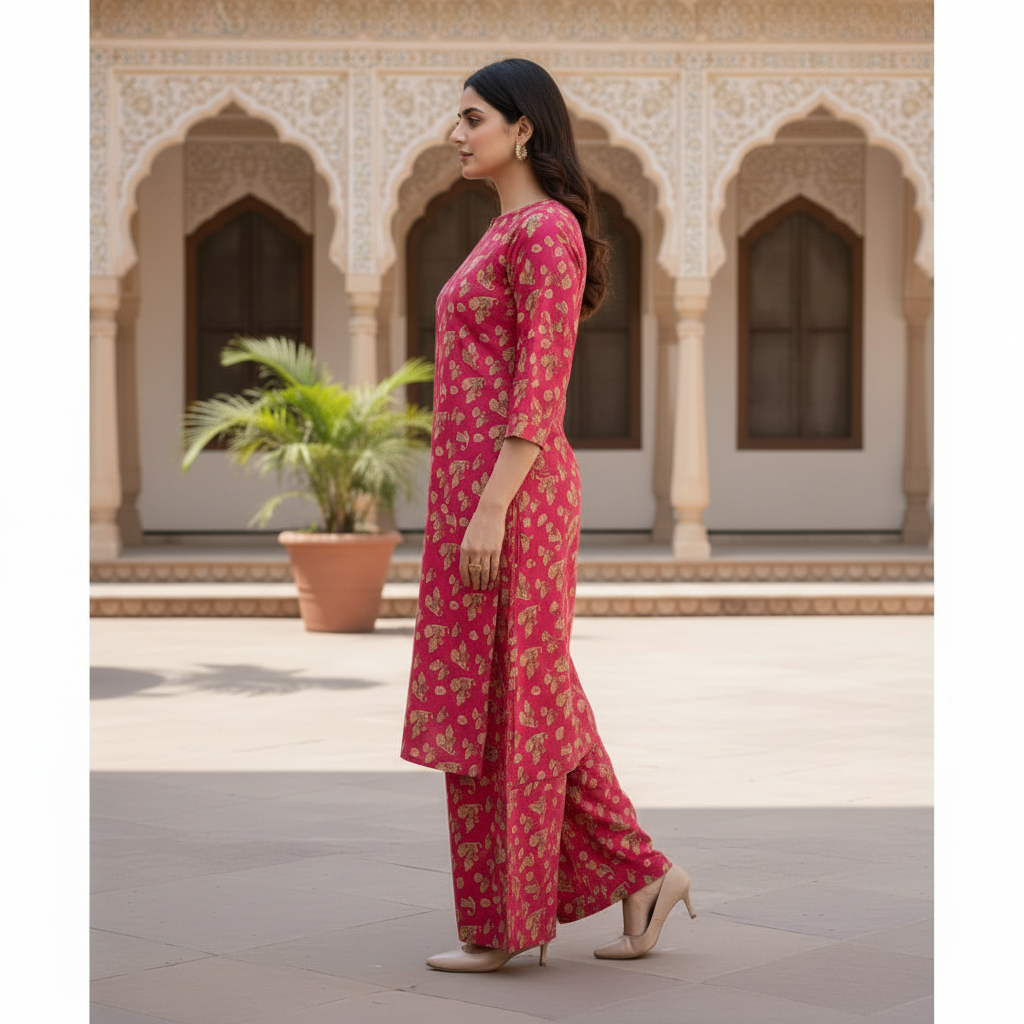 • Cut: A graceful long-shirt silhouette paired with matching printed trousers for a classic, feminine look.