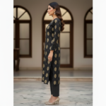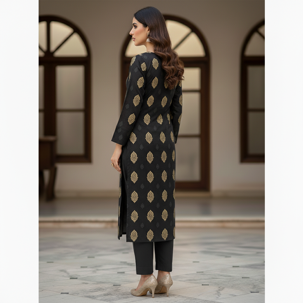 • Design Details: A timeless midnight black base enriched with traditional antique gold zari paisley (leaf) motifs. The intricate gold work is balanced with subtle charcoal accents, creating a high-contrast, formal look.