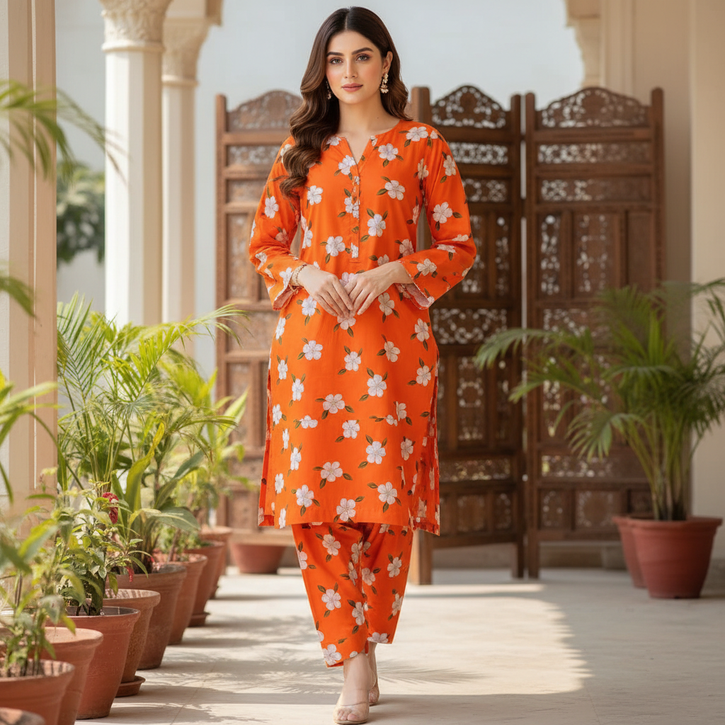 Category: 2 Pieces Tags: Bright Ethnic Wear., Floral Co-ord Set, Orange Lawn Suit, Summer 2026, Women's Printed Suit