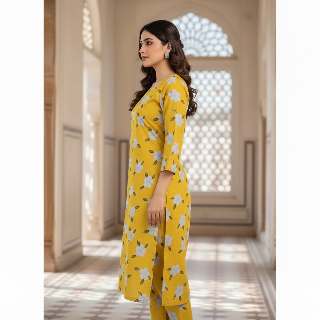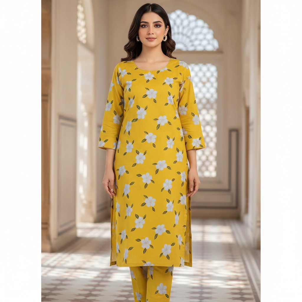 Category: 2 Pieces Tags: Bright Summer Wear, Floral 2-Piece, Printed Kurta Trouser., Women's Co-ord Set, Yellow Lawn Suit