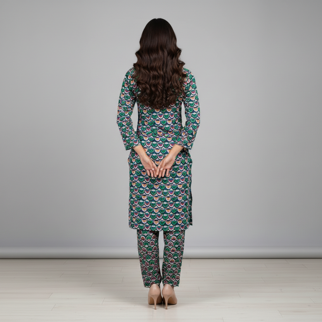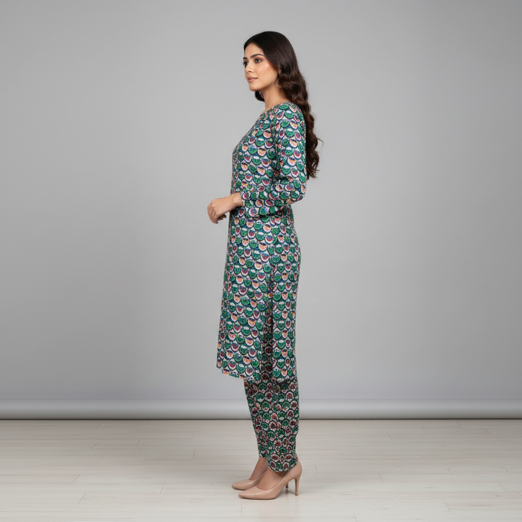 Category: 2 Pieces Tags: Intricate Printed 2-Piece, Modern Traditional Wear., Mosaic Geometric Print, Multi-Color Ethnic Wear, Summer Co-ord 2026, Teal Lawn Suit