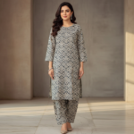 Category: 2 Pieces Tags: 2pc Cotton Outfit, Geometric Print Suit, Grey Co-ord Set, Neutral Tone Dress, Professional Wear