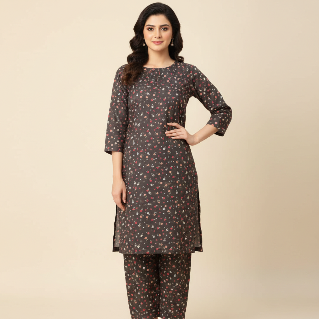 • Traditional Pairing: Complemented with a matching printed Shalwar, bringing a classic ethnic touch to this modern co-ord set.