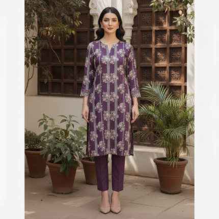 • Embroidery Details: Features elegant vertical white lace-style embroidery that creates a slimming, elongated silhouette. The shirt is adorned with delicate purple floral bouquets and finished with white pom-pom lace detailing on the daman and sleeves.