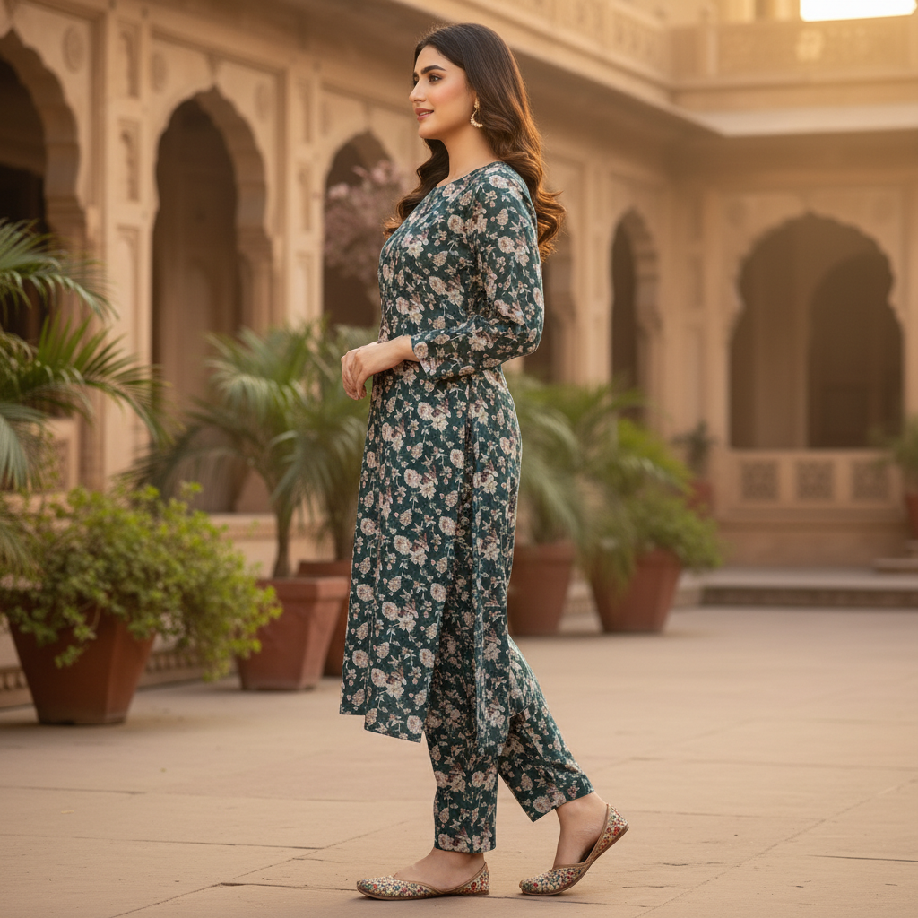 • Cut: A graceful straight-cut silhouette paired with matching solid lilac trousers, offering a perfect blend of tradition and modern style.