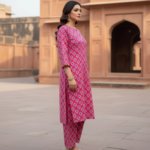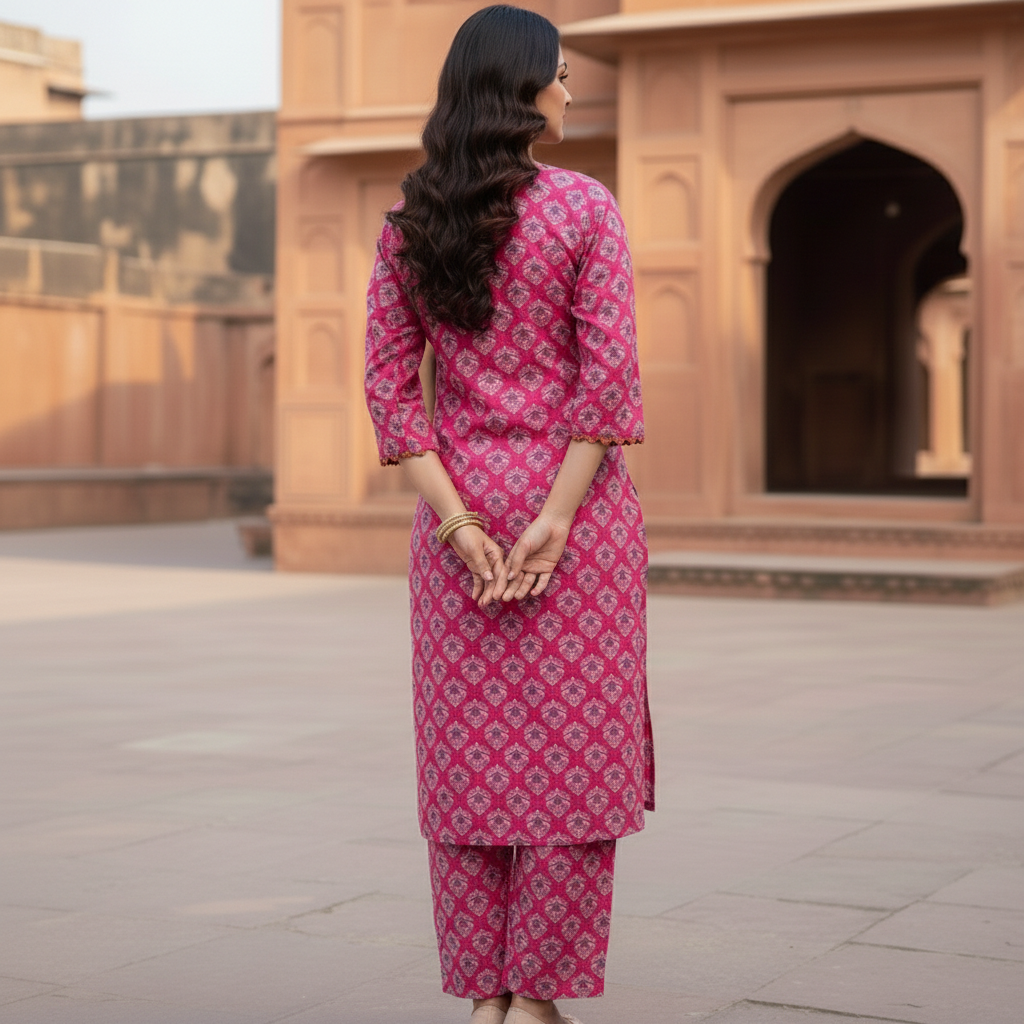 Category: 2 Pieces Tags: 2pc Cotton Set, Festive Co-ord, Geometric Paisley, Magenta Pink Suit, Printed Kurta Trouser.