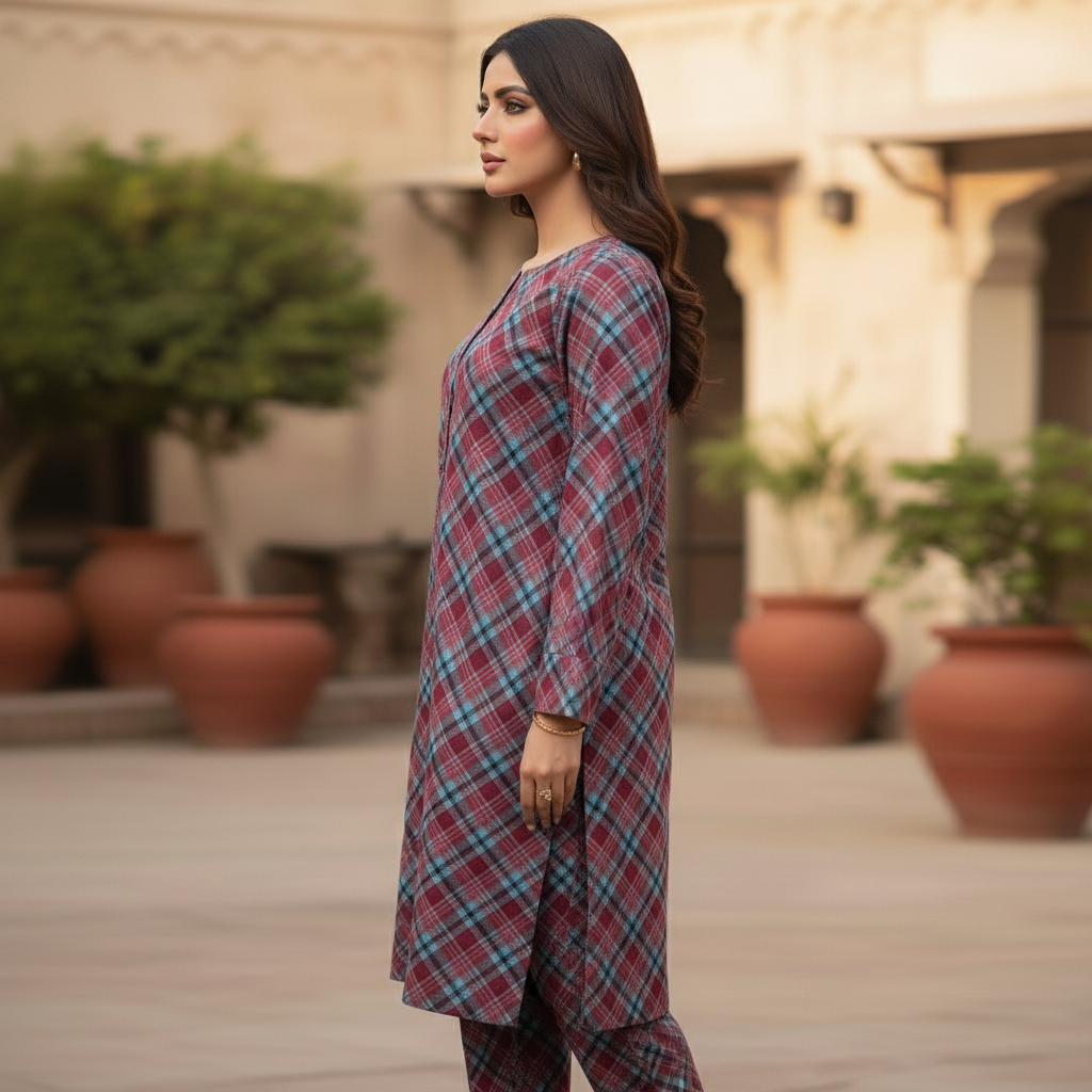 Category: 2 Pieces Tags: 2pc Professional Wear, Daily Wear Suit., Geometric Print Cotton, Maroon Co-ord Set, Plaid Check Suit