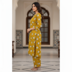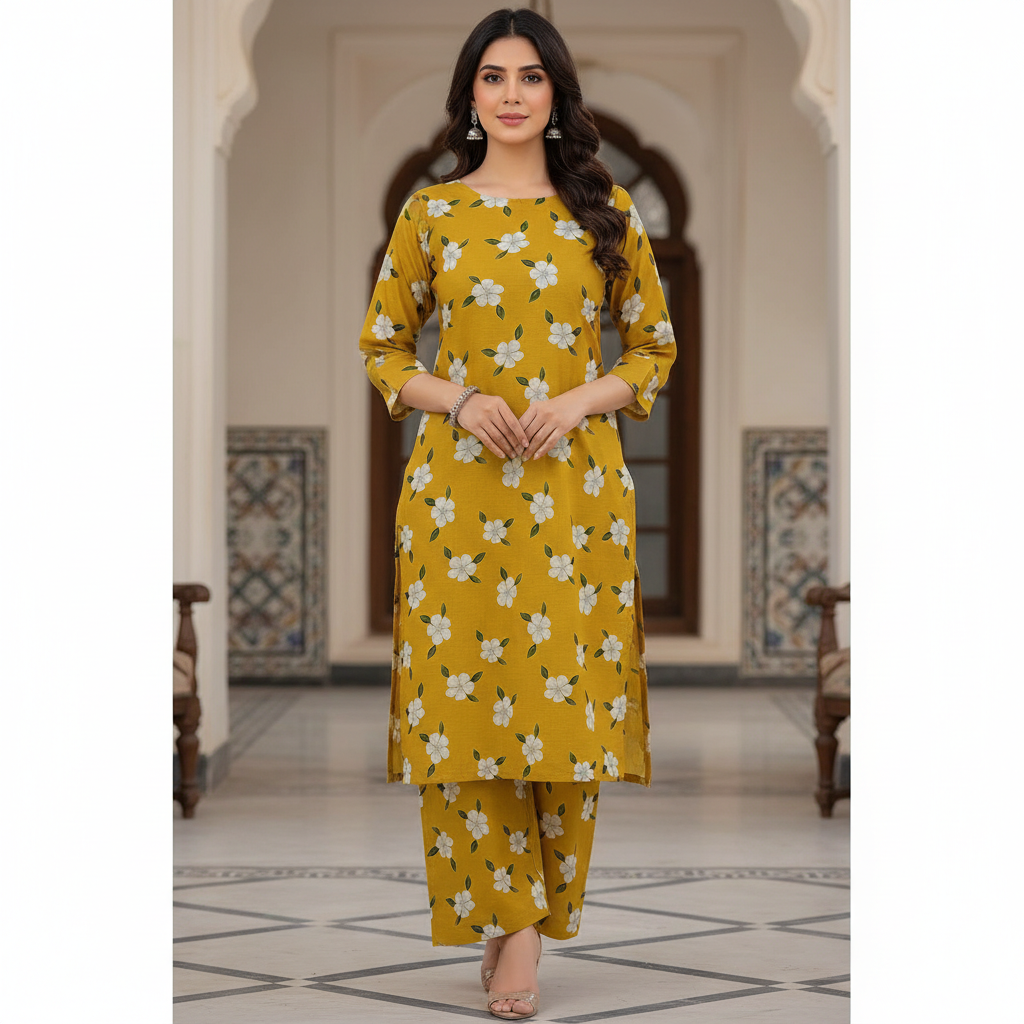 • Design Details: A bright, cheerful mustard yellow base decorated with a delicate all-over ivory jasmine floral print. The fabric’s natural “self-check” texture adds a premium, sophisticated finish to the vibrant color.