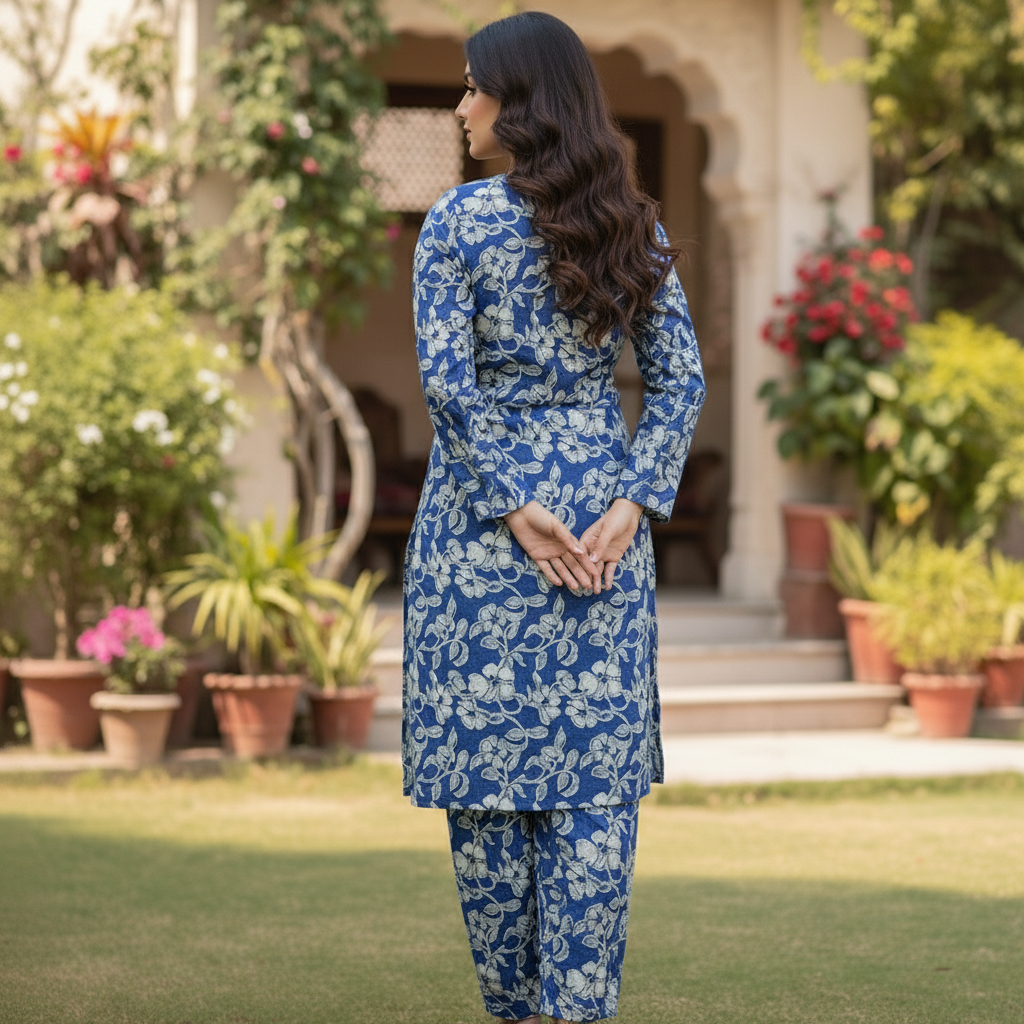 Category: 2 Pieces Tags: Blue Floral, Ethnic Vines, Indigo Print, Royal Blue Lawn, Summer 2026, Traditional Co-ord