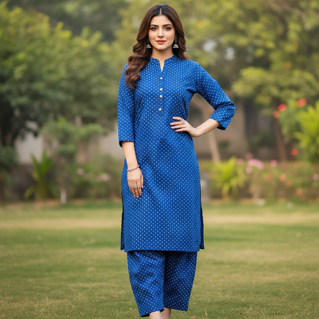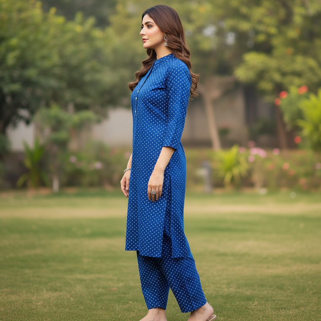 Category: 2 Pieces Tags: Blue Lawn Suit, Casual Ethnic Wear., Polka Dot Print, Royal Blue 2-Piece, Summer Co-ord 2026
