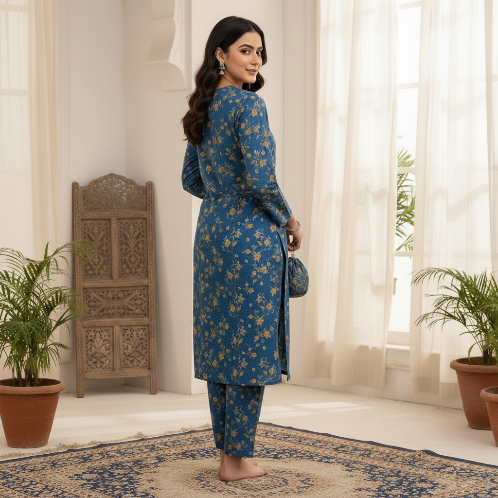 Category: 2 Pieces Tags: 2pc Cotton Set, Teal Blue Suit, Traditional Co-ord, Vintage Floral Print, Women's Casual Wear