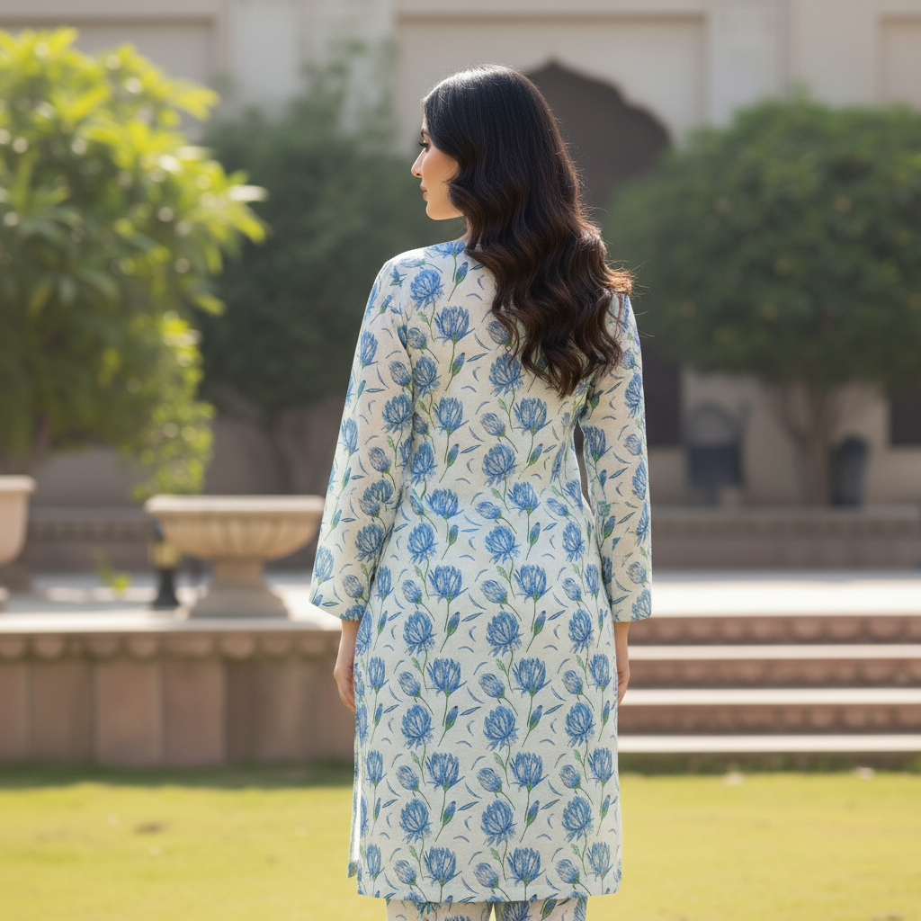 Category: 2 Pieces Tags: 2pc Summer Suit, Blue Lotus Print, Cotton Floral Outfit, Fresh Summer Look., White Co-ord Set